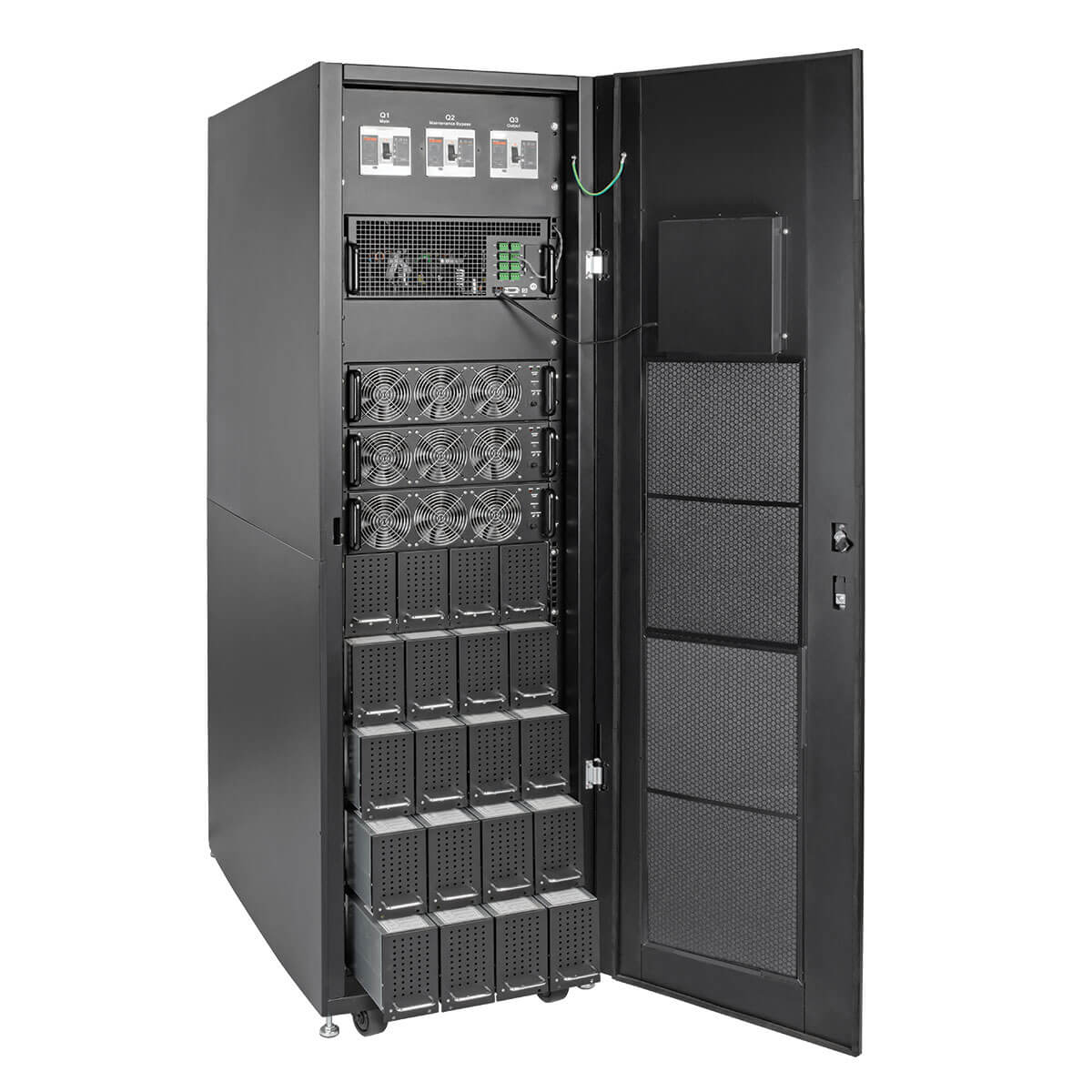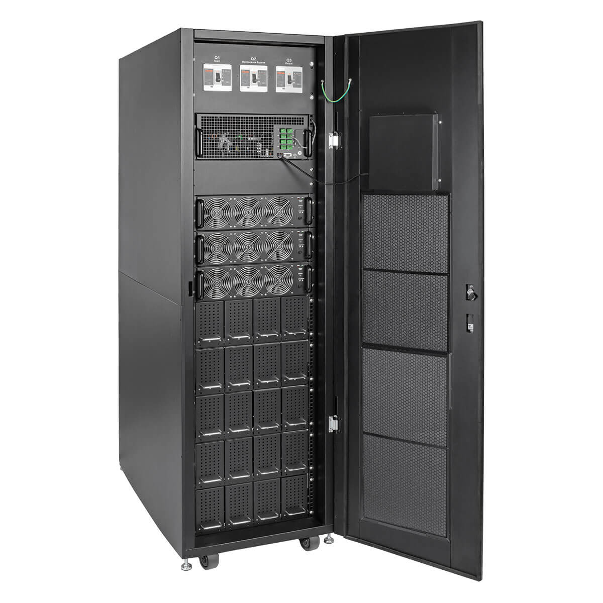 The SVX90KM3P5B 90kVA/90kW SmartOnline® Medium-Frame UPS includes installed input, bypass and output breakers, a static transfer switch (STS) and three included 30kVA SVX30PM power modules. This system supports the addition of one additional user-installable SVX30PM power module to accommodate 90kW total capacity with N+1 fault-tolerance. Five internal battery modules are included to fully load internal battery compartments. Additional runtime is available using any number of compatible ±240VDC external battery packs (sold separately).