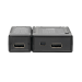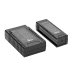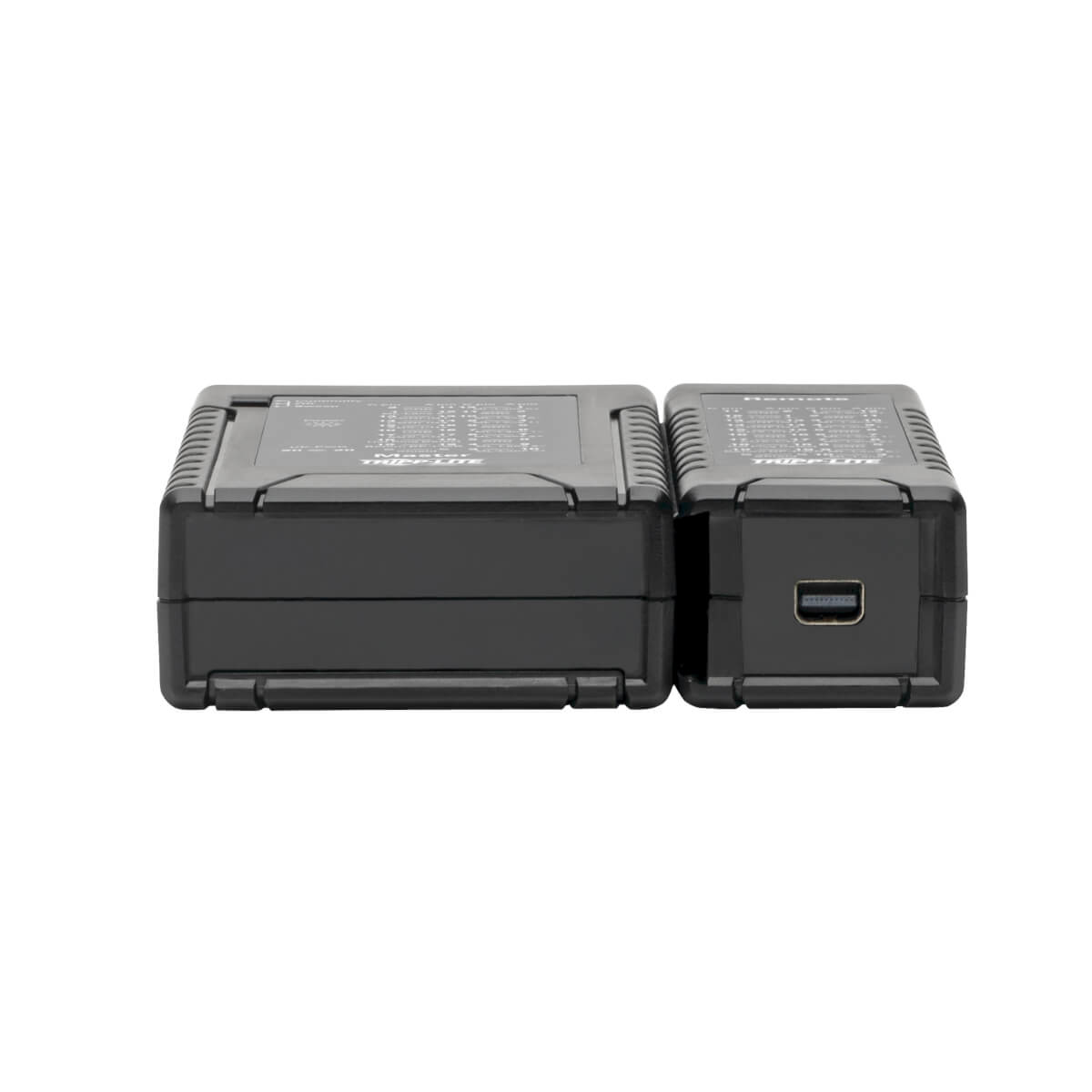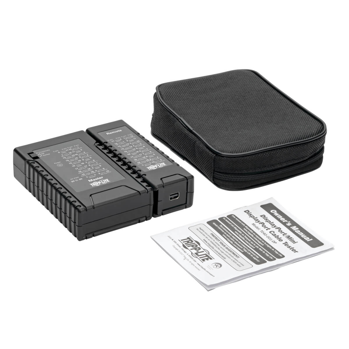 This DisplayPort tester consists of a main tester unit and a removable remote identifier that are secured in a protective carrying case when not in use. The tester units are powered by a standard 9-volt battery (not included). To test a cable that has already been installed, separate the two units and connect them to each end of the cable.