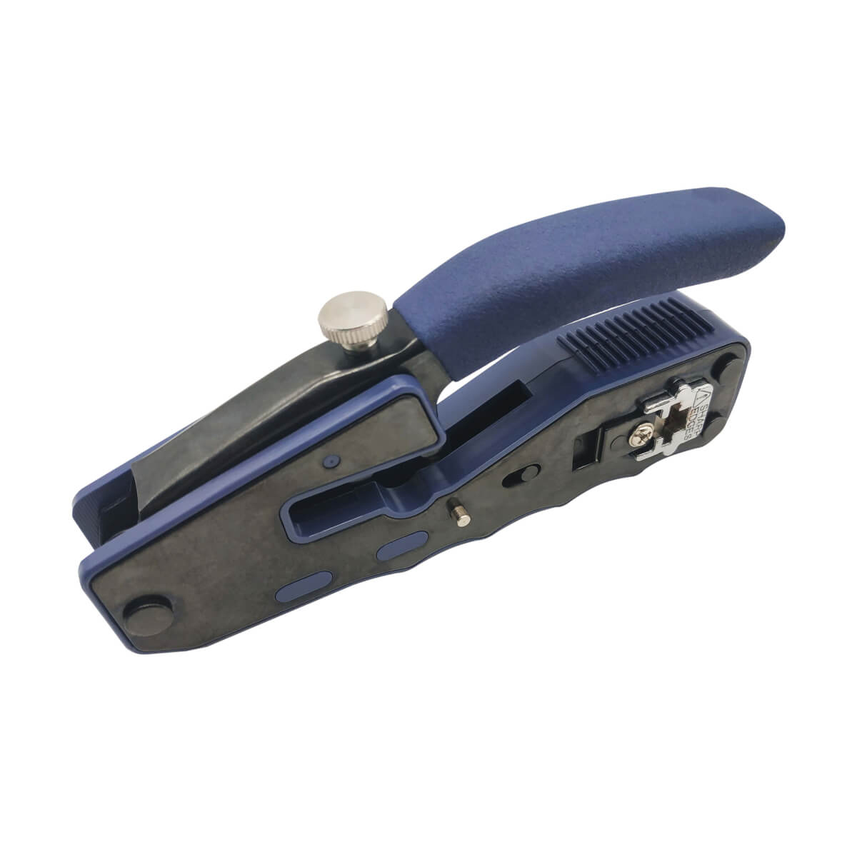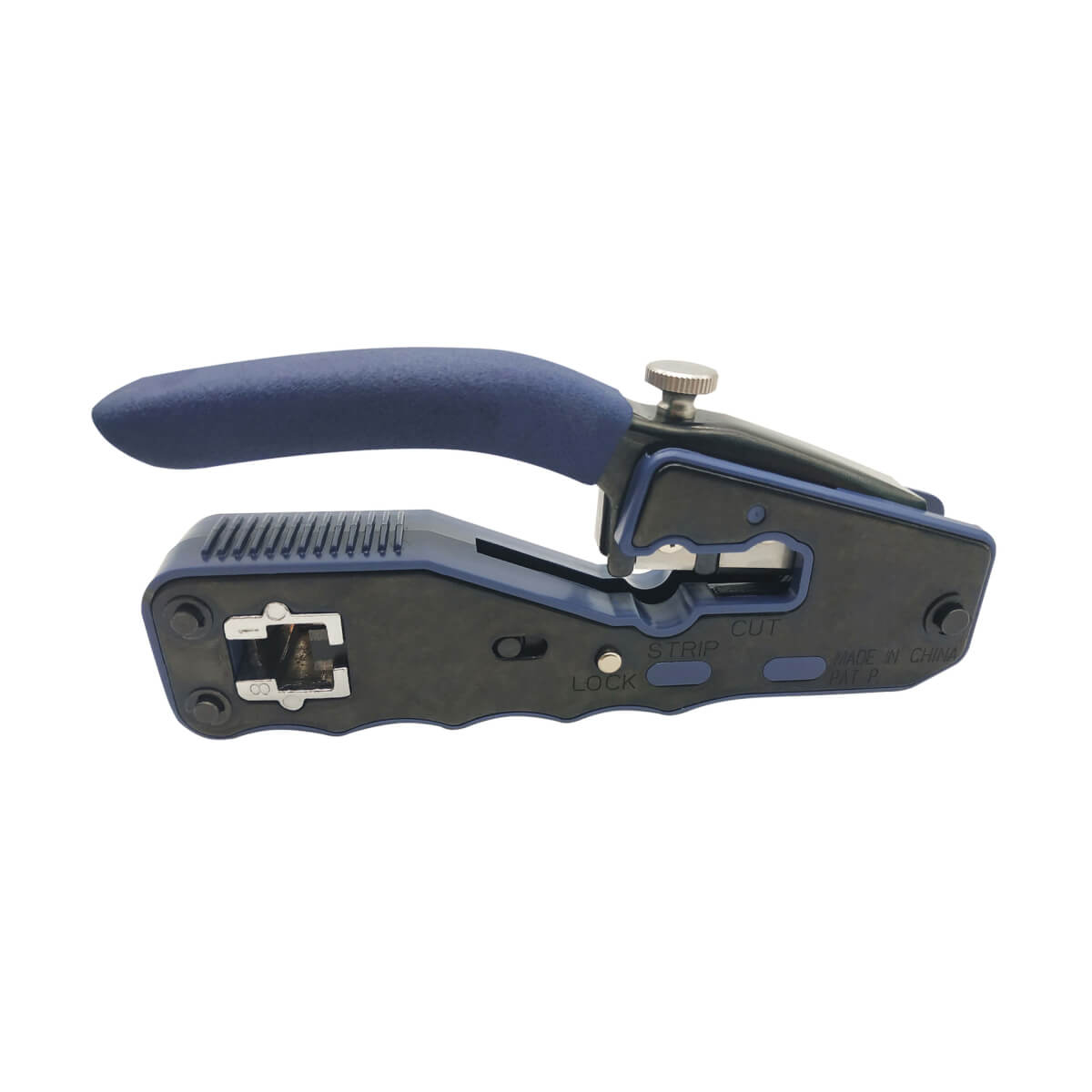Crimping Tool with Cable Stripper for Pass-Through RJ45 Plugs