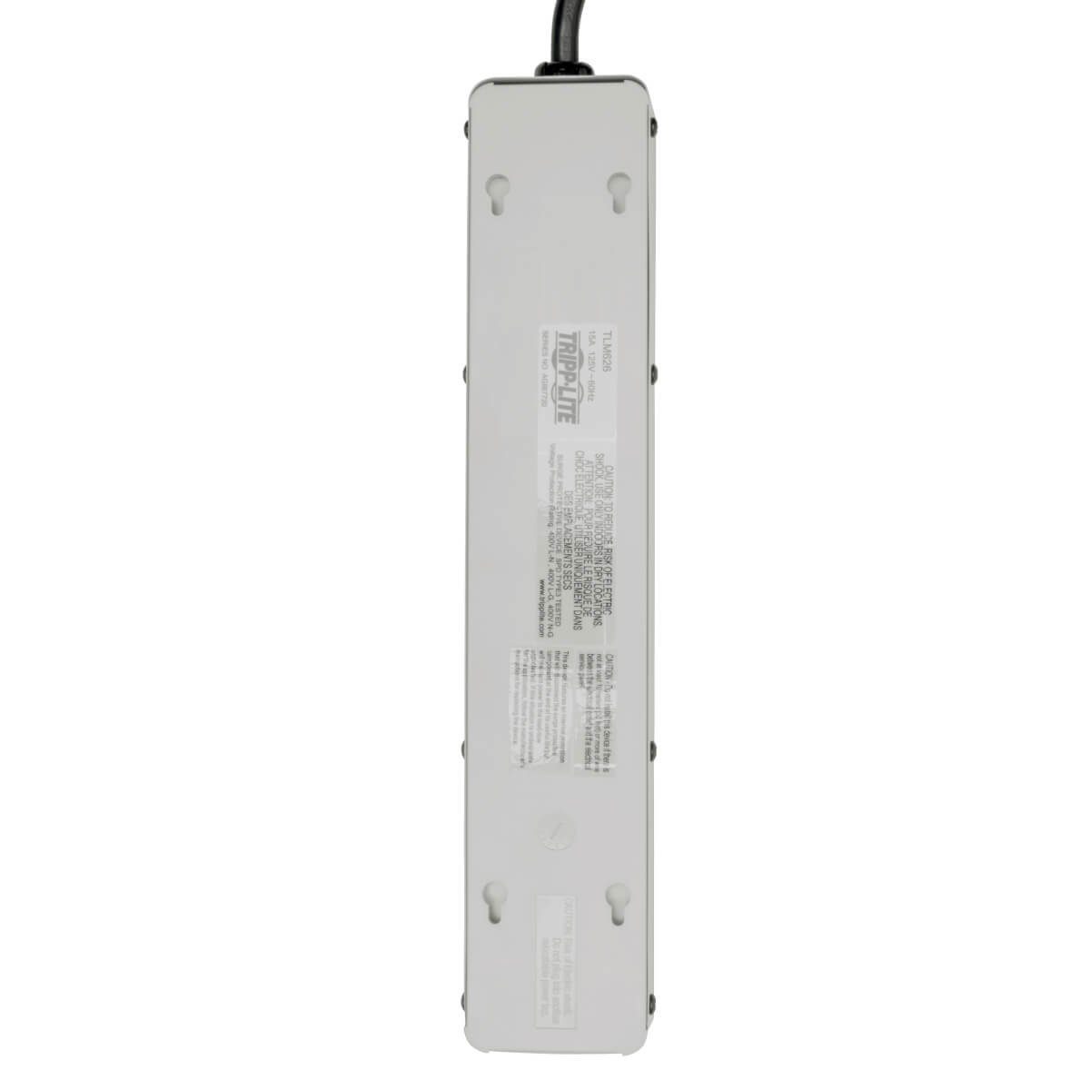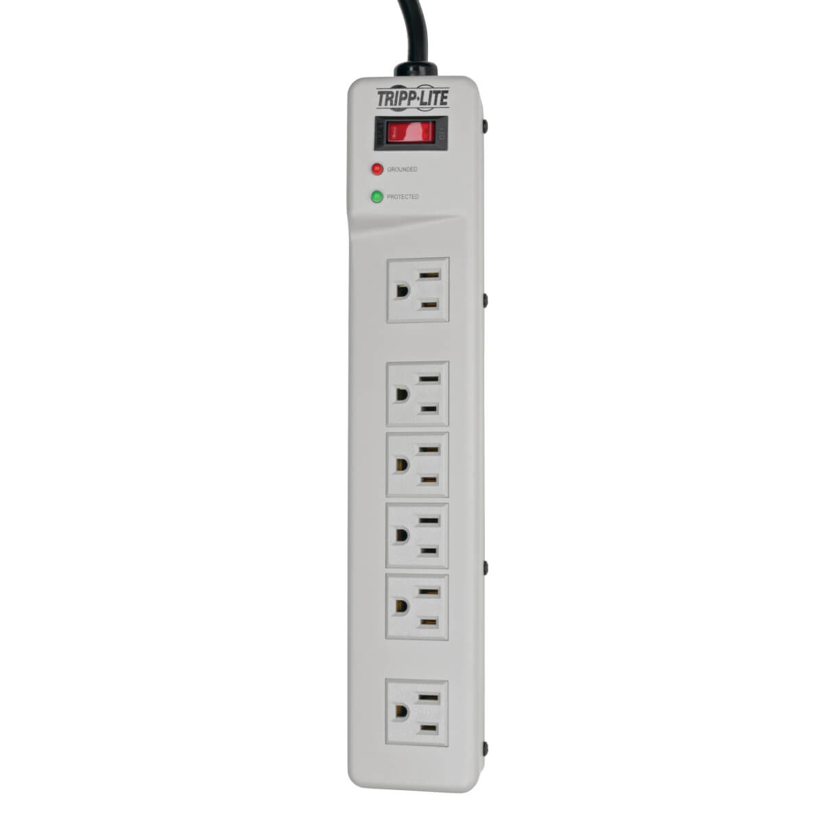 Tripp Lite's TLM626 surge suppressor offers complete AC surge suppression for comprehensive protection of workstations, personal computers, home stereos, televisions, VCRs, DVD players and other sensitive electronics. Heavy grade AC surge suppression shields connected equipment from damage and performance problems due to transient surges. TLM626 offers 6 right-angle outlets, a 6 foot power cord and diagnostic LEDs to warn of wiring problems and suppressor damage. AC surge suppression rated at 1208 joules shields equipment from surges and line noise. Rugged metal housing with 2 designated transformer plug outlets offers convenient protection of desktop computer equipment and accessories. Lifetime warranty with $75,000 Ultimate Lifetime Insurance (USA & Canada Only).