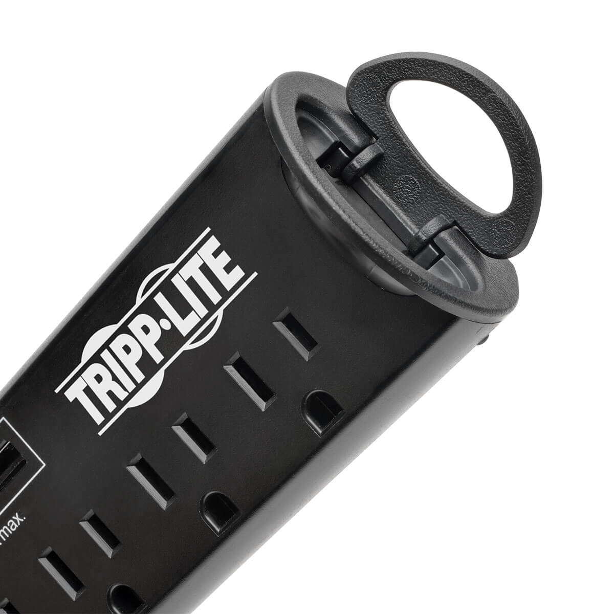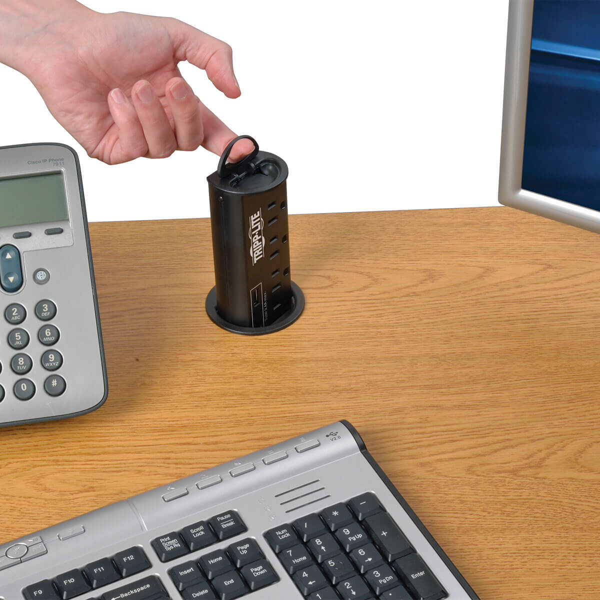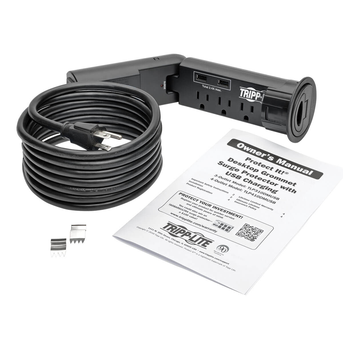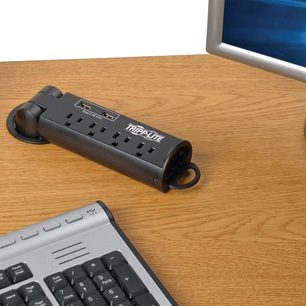 Recommended for home or office workstations, the TLP410DMUSB is designed for installation in your desktop’s 60-millimeter (2.4 inches) grommet hole (if your desk has no pre-cut hole, you can drill one yourself). It folds onto the desktop for connection of equipment. An LED indicates surge suppression at a glance. A resettable 15A circuit breaker shuts down equipment in case of an overload.