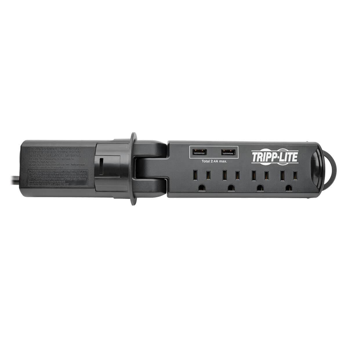 The TLP410DMUSB Protect It!® 4-Outlet Surge Protector features four NEMA 5-15R outlets and a surge suppression rating of 1500 joules to protect your components against surges, spikes and EMI/RFI line noise that can damage sensitive electronics and destroy data. Plus, two USB ports produce 2.4A of combined power to charge your mobile devices, such as smartphones, tablets and MP3 players.