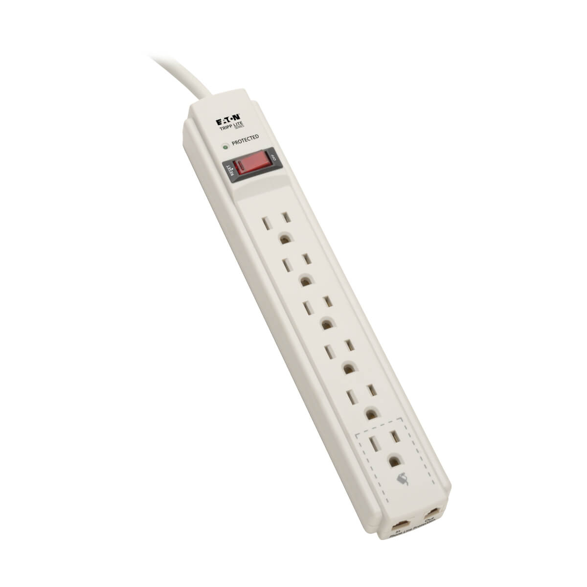 Tripp Lite's TLP604TEL Surge Suppressor offers economical AC and phone line surge suppression for full protection of workstations, desktop PCs, telecom systems and other sensitive electronics. Built-in AC surge suppression shields connected equipment from damage and performance problems due to transient surges. Set of RJ11 telephone line suppression jacks protect dialup and DSL modem lines, fax machines, cordless phones and more. TLP604TEL offers 6 total outlets, 4 foot cord and diagnostic LED to warn of suppressor damage. AC suppression rated at 790 joules shields equipment from surges and line noise. Attractive white suppressor housing with keyhole mounting tabs and 1 designated transformer plug outlet offers convenient protection of desktop computer equipment and accessories. $20,000 Ultimate Lifetime Insurance (U.S., Canada, and Puerto Rico only).