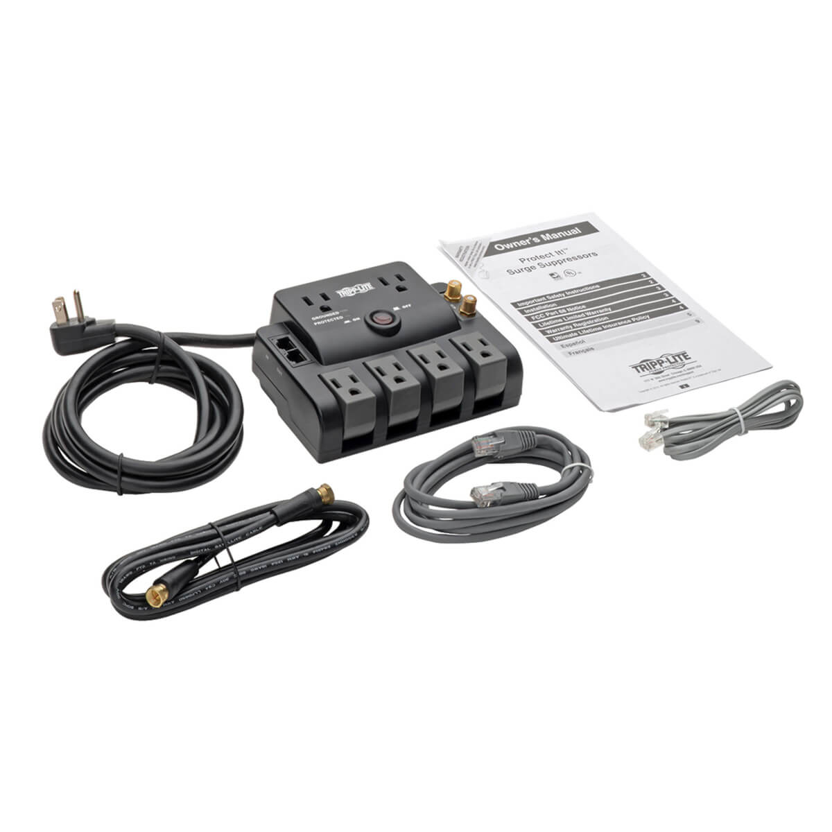 Tripp Lite's TLP606RNET Surge Suppressor provides high-performance protection--1440 joules--stopping damaging surges and filtering disruptive line noise so components perform at their peak! 6 outlets - 4 that rotate, 2 that are standard, 1-line coaxial protection - that also rotates and 1-line tel/modem for maximum protection. $150,000 Ultimate Lifetime Insurance (U.S., Canada, and Puerto Rico only). Includes two diagnostic LEDs, 6 ft. gold coaxial cable, 6ft network cable and 6 ft. phone cord.