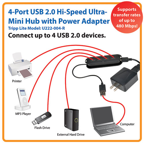 4-Port USB 2.0 Ultra-Mini Compact Hub with Power Adapter