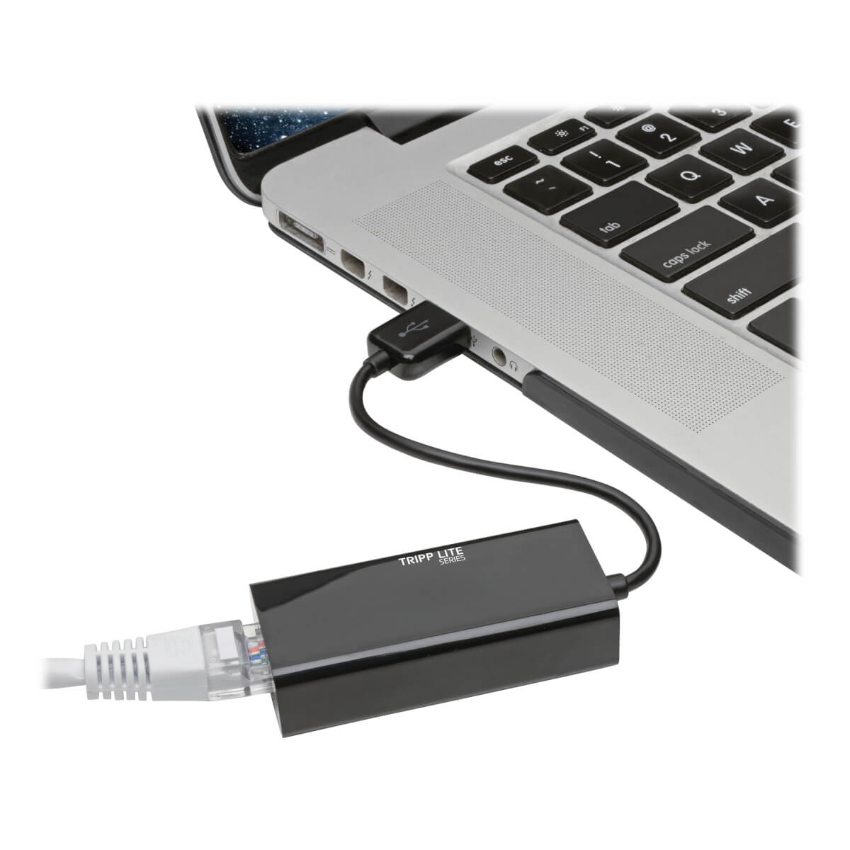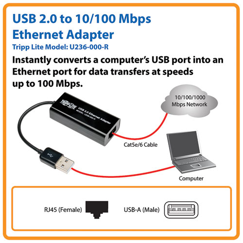 This USB 2.0 Ethernet adapter offers access to an Ethernet network when Wi-Fi is unavailable or when a wired connection offers faster speeds. Just connect the built-in USB cable to your device’s USB port (which also powers the adapter), and wait for the installation process to finish (you may have to reboot your computer). Then, connect the RJ45 port to a LAN port using a Cat5e/6 network cable (such as N201-Series Cat6 UTP patch cable, sold separately). The adapter works with Windows, Mac and Linux operating systems. It is backward compatible with USB 1.1 devices.