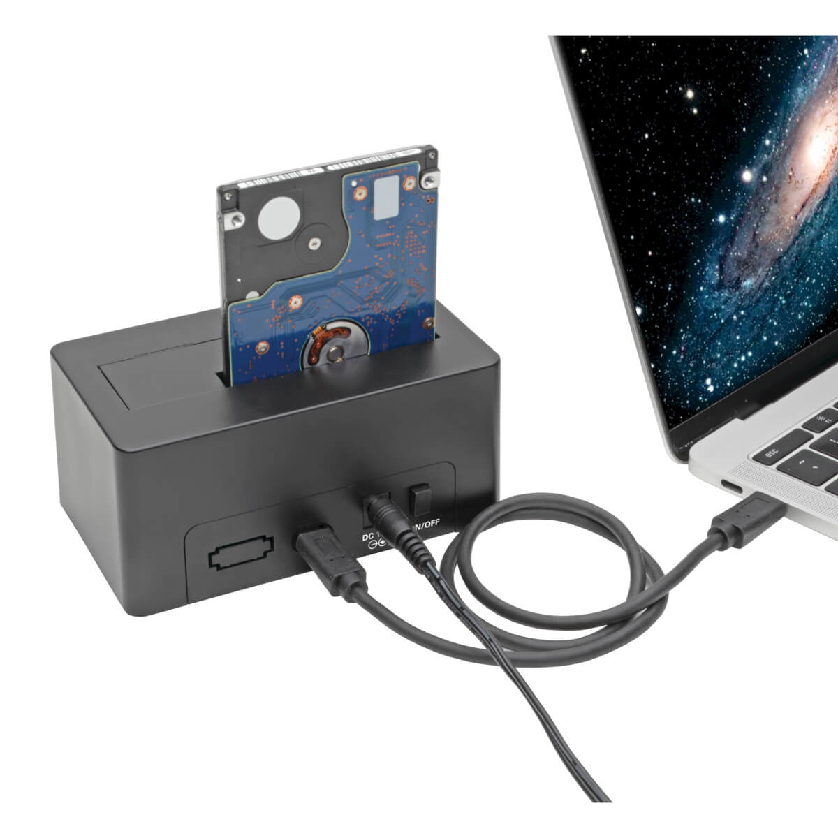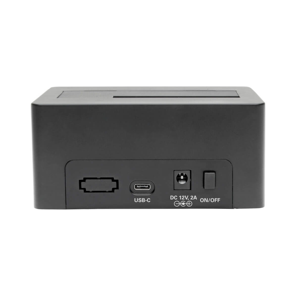 This single-drive USB 3.1 Type-C to SATA quick dock allows you to quickly and easily add extra storage space to your computer, tablet, laptop, notebook, MacBook, Ultrabook or Chromebook. The plug-and-play unit connects to your device’s USB Type-C or Thunderbolt 3 port using the included USB 3.1 Gen 2 cable. Just insert a 2.5- or 3.5-inch SATA drive into the top slot, and activate the on/off switch. An LED indicates a link with the device’s USB port.
