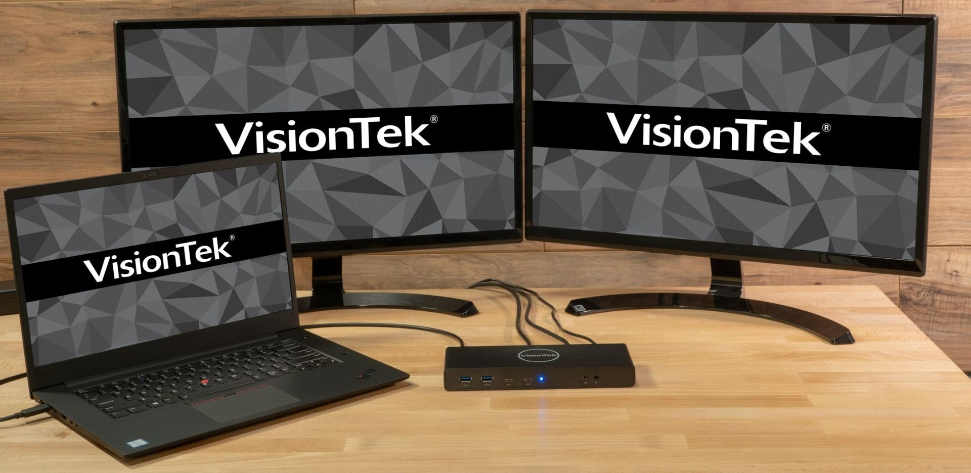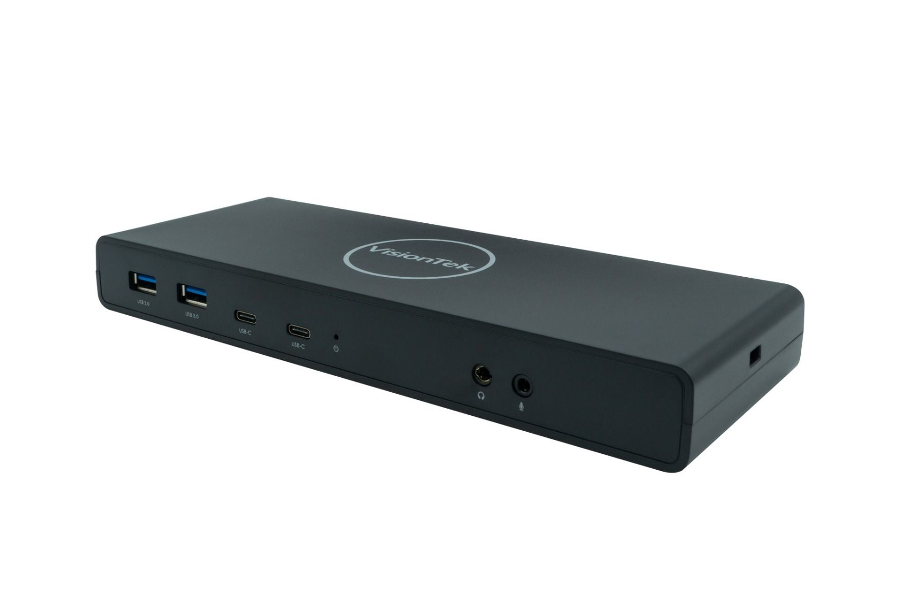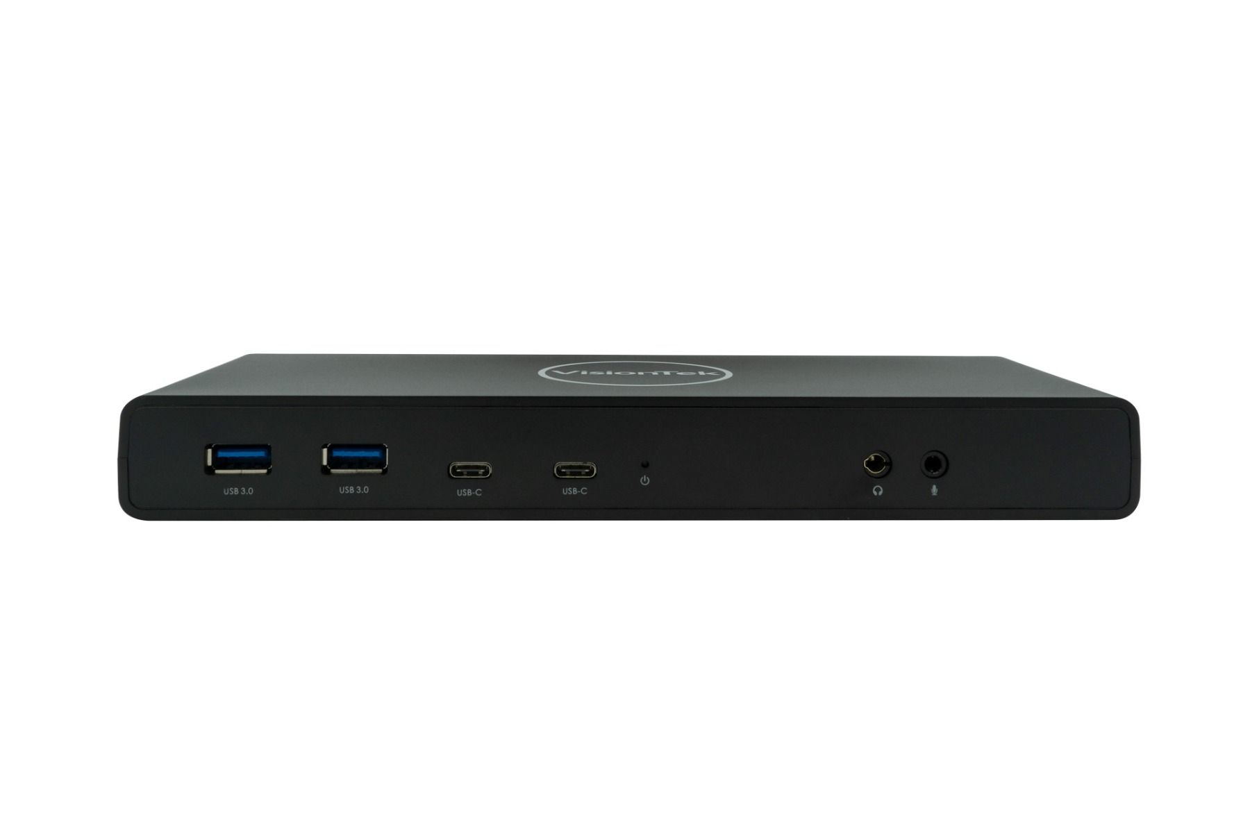 The VisionTek USB Dual 4K Universal docking station allows you to easily connect your Windows, Mac OS or ChromeOS laptop to dual-4K displays and up to eleven accessories and peripherals through a single USB connection. This high-quality dock is a single-cable solution that enables you to take full advantage of up to three monitors and Ultra HD technology, even if it isn't natively supported by your computer’s video card. You can easily turn your laptop into a complete workstation by adding peripherals such as a full-sized keyboard, mouse, external hard drives, printers, webcams and projectors. This all-in-one dock delivers a total of 11 ports in a unit designed to instantly connect and disconnect from your USB laptop through a single high-speed cable. Featuring DisplayPort Multi-Stream Transport, USB Type A and Type C connectivity, HDMI, audio and Ethernet connections, this full-featured USB dock allows your laptop to perform like a desktop. This single-cable docking station is ideal for creative professionals such as video producers, graphic and web designers, engineers, architects, students, gamers and more, including graphic and web designers, animators, and professionals who work with highly detailed graphics. The ability to scale your desktop across multiple displays also makes this dock perfect for government, finance, medical imagery, marketing and sales environments or other complex work. The Visiontek USB Dual 4K Universal docking station supports resolutions up to dual 4K HDMI, 4K DisplayPort, 4K HDMI + 4K DisplayPort output in both extended and mirrored modes. In addition to being compatible with both Type-C and Type-A laptop and desktop computers, this docking station also supports microphone input and audio output, USB 3.0 with transfer speeds up to 5Gbps and backward compatible with USB 2.0 and USB 1.1 and USB Type-C. Built in 10/100/1000BASE-T Gigabit Ethernet RJ45 Port.