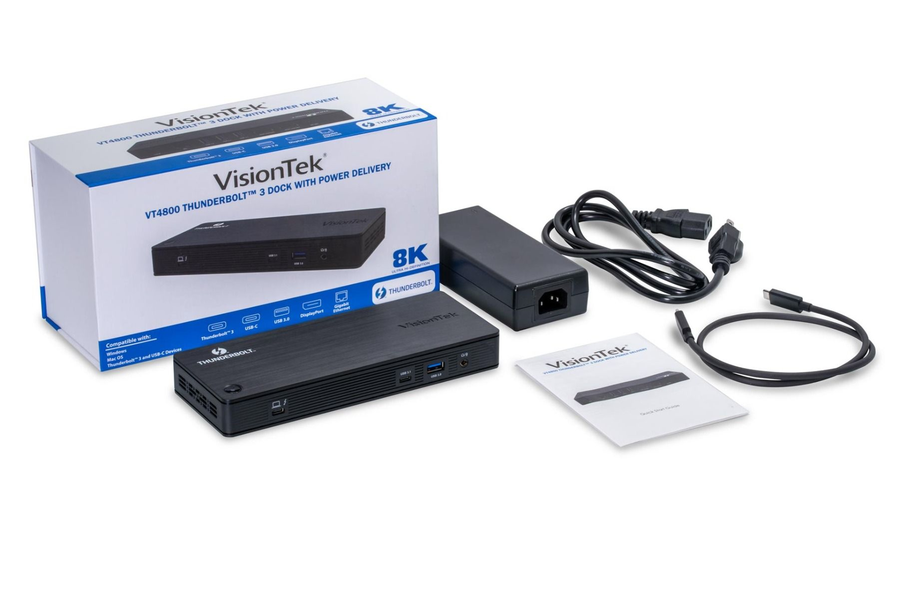 Increase productivity with our plug and play, power delivery docking station, the VisionTek VT4800 Thunderbolt™ 3 and USB-C Docking Station with Power Delivery for Windows™ and Mac™ laptop systems. With a single USB-C or TB3 connection, you can connect up to two external monitors, transfer files and data at up to 10Gbps, play audio, charge mobile devices and your system.